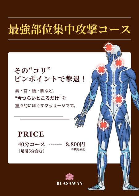 日々のデスクワークやスマホ操作で、肩・首・腰・脚など「今つらい部分」だけを徹底的にほぐしたい——。